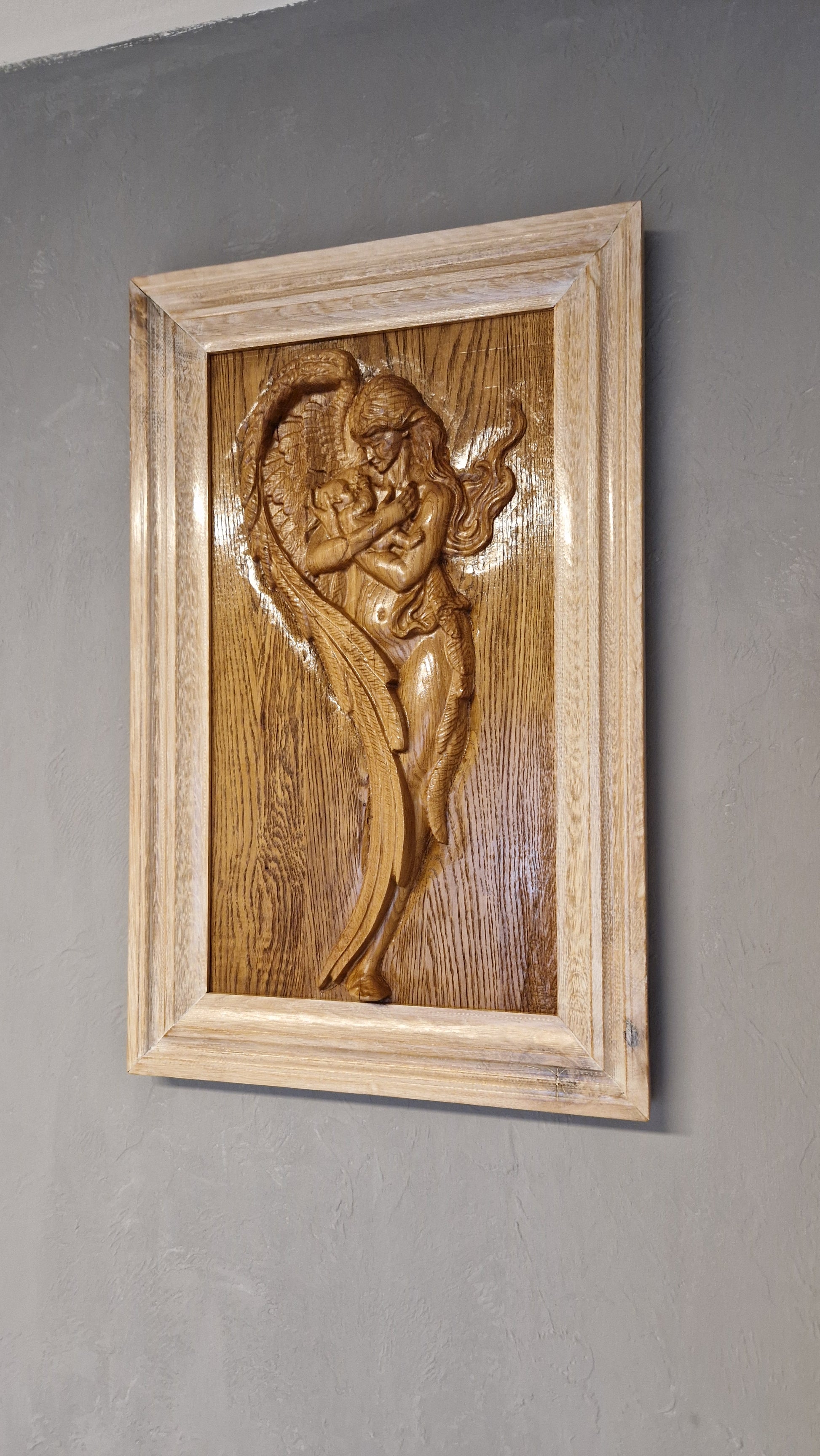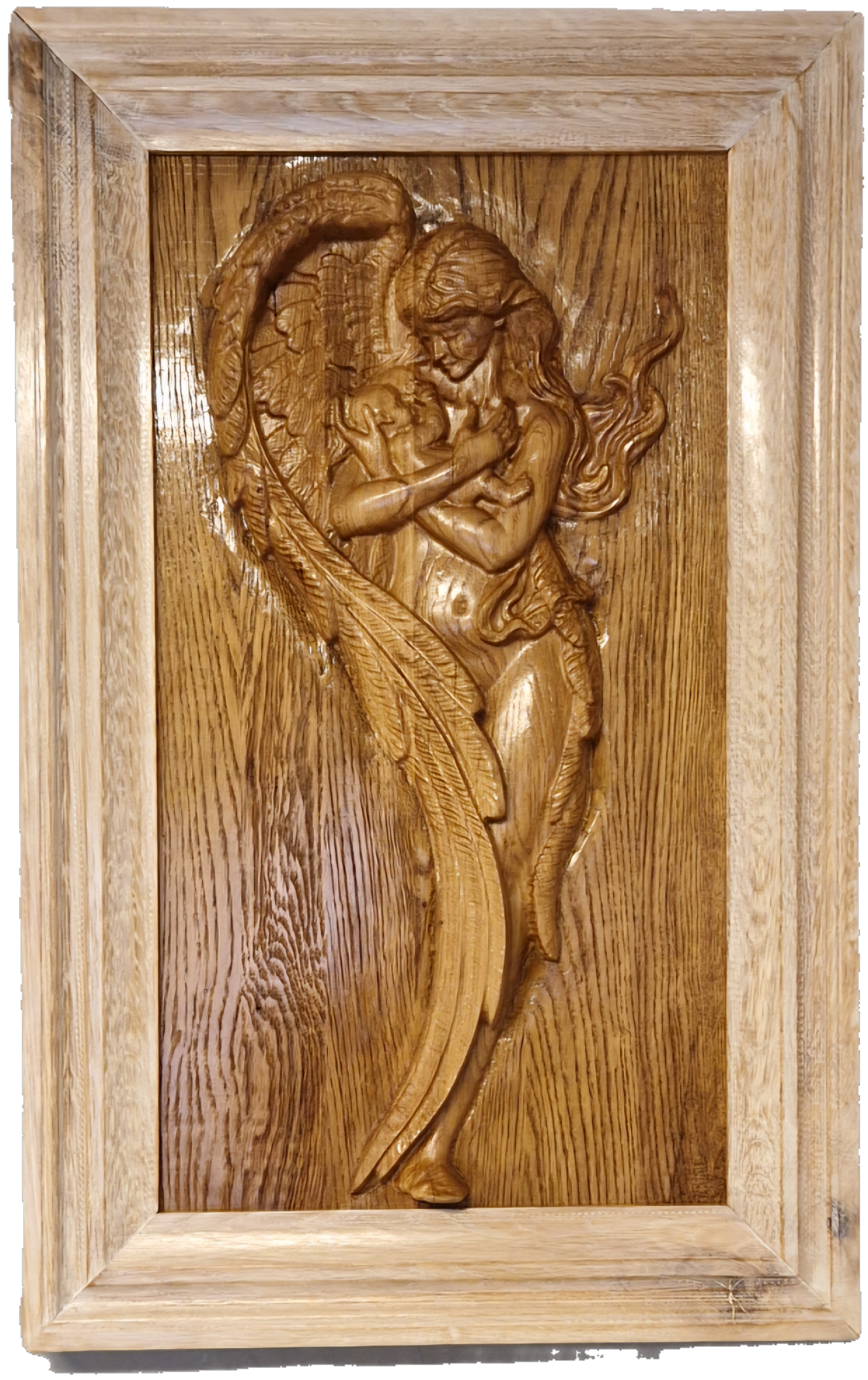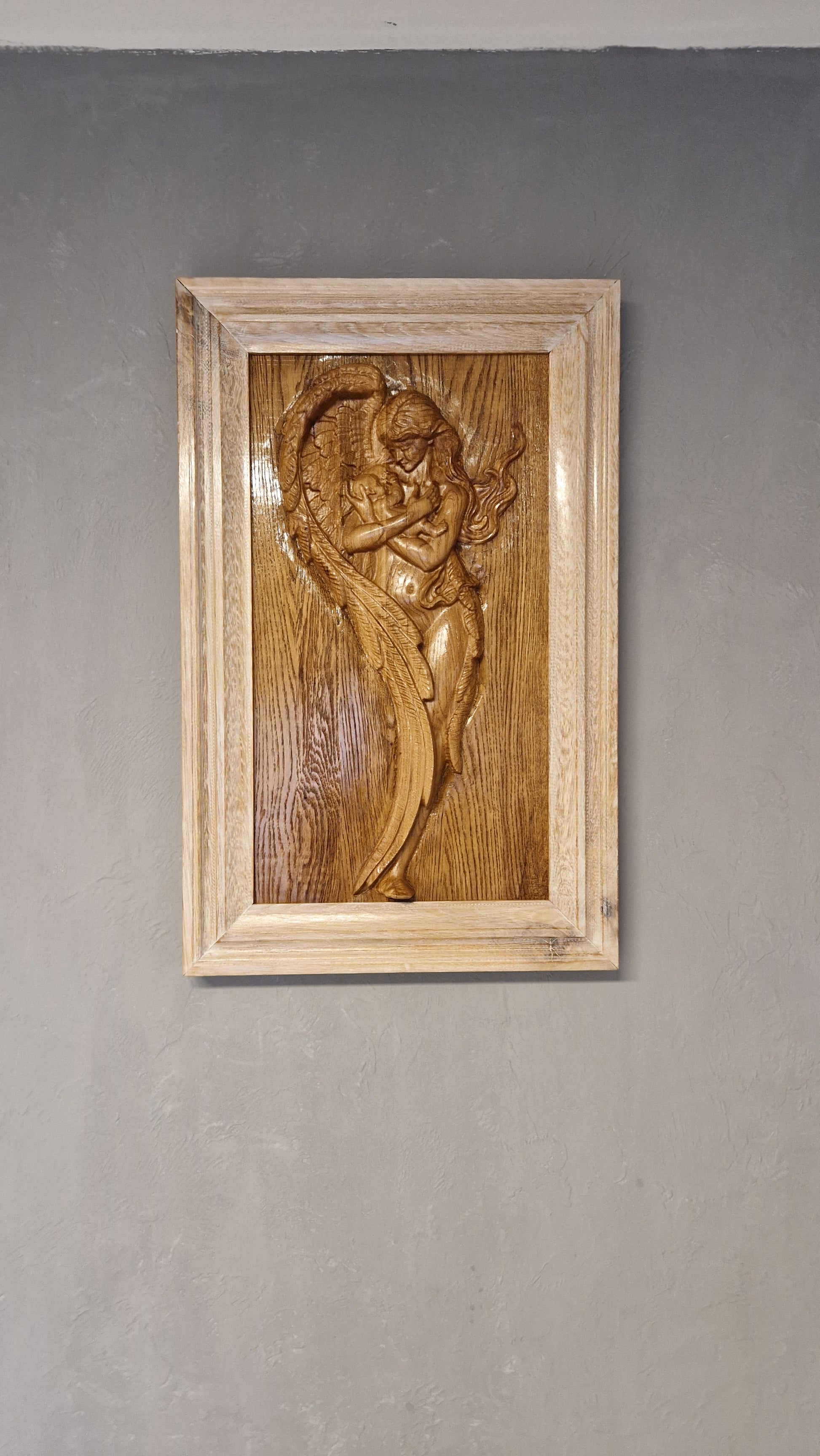 Descoperă eleganța și emoția întruchipate în această minunată sculptură din lemn de stejar, reprezentând o femeie înger ce ține în brațe un copil. Fiecare detaliu al acestei opere de artă transmite o poveste de dragoste, protecție și puritate.
